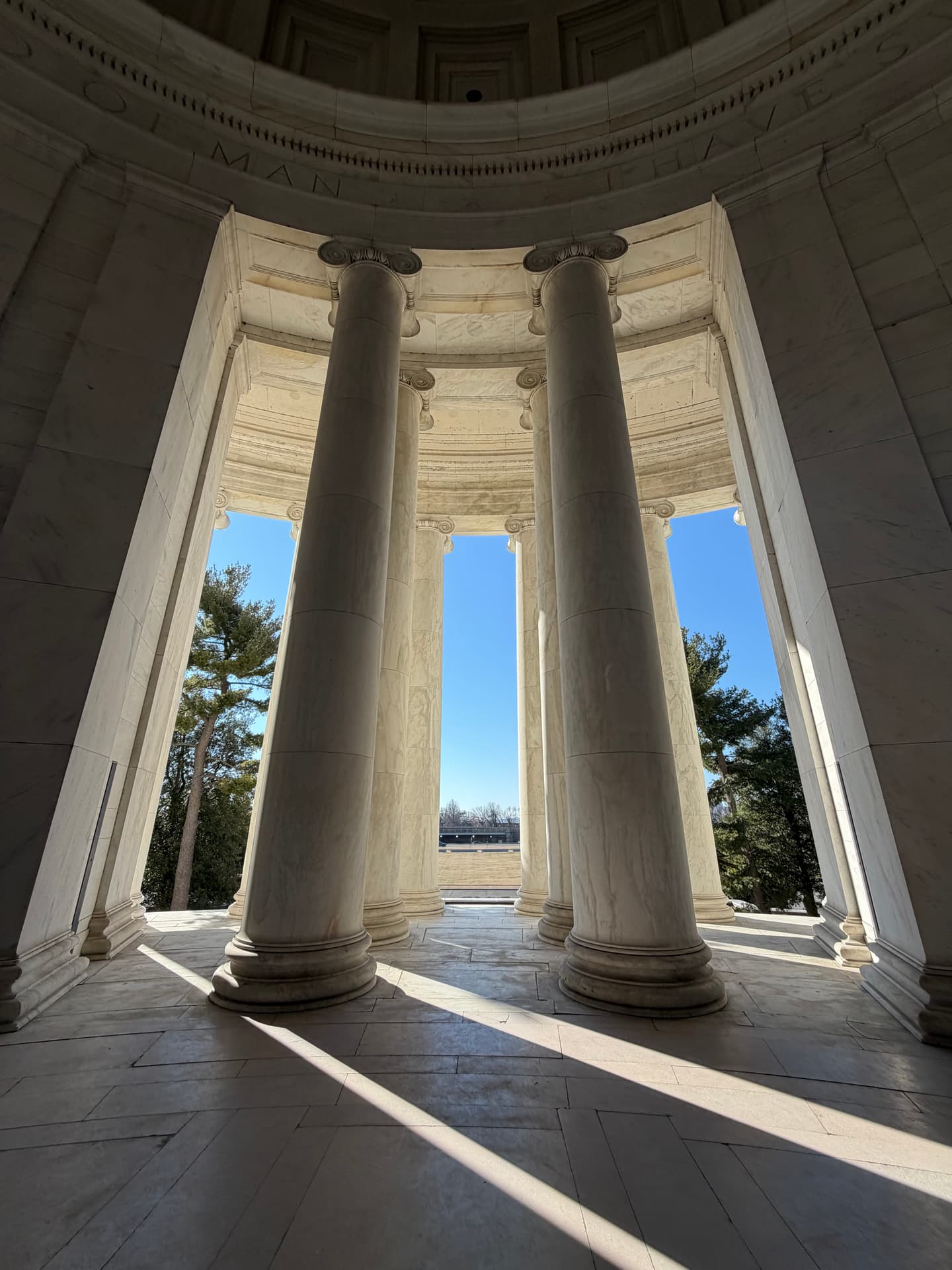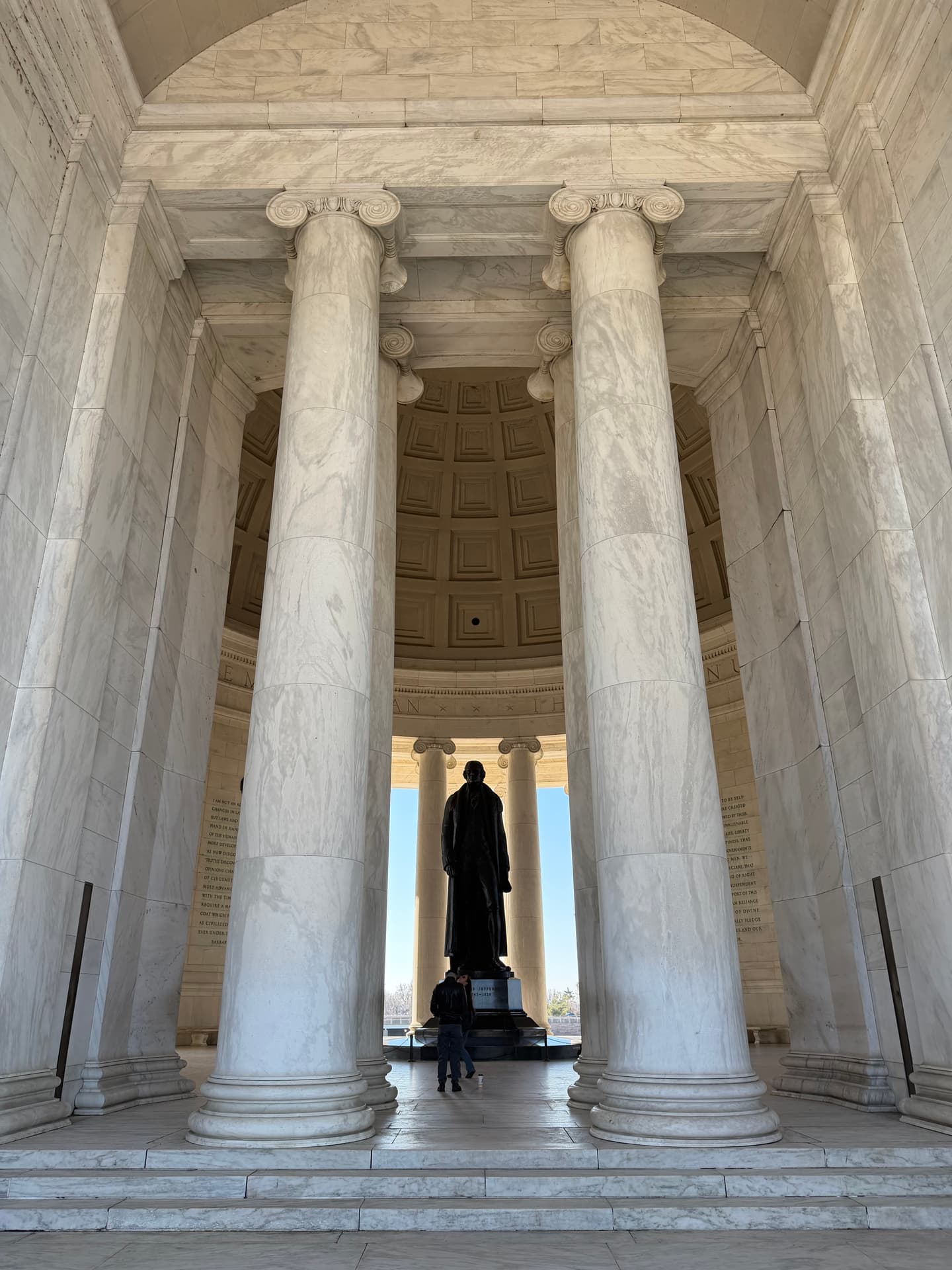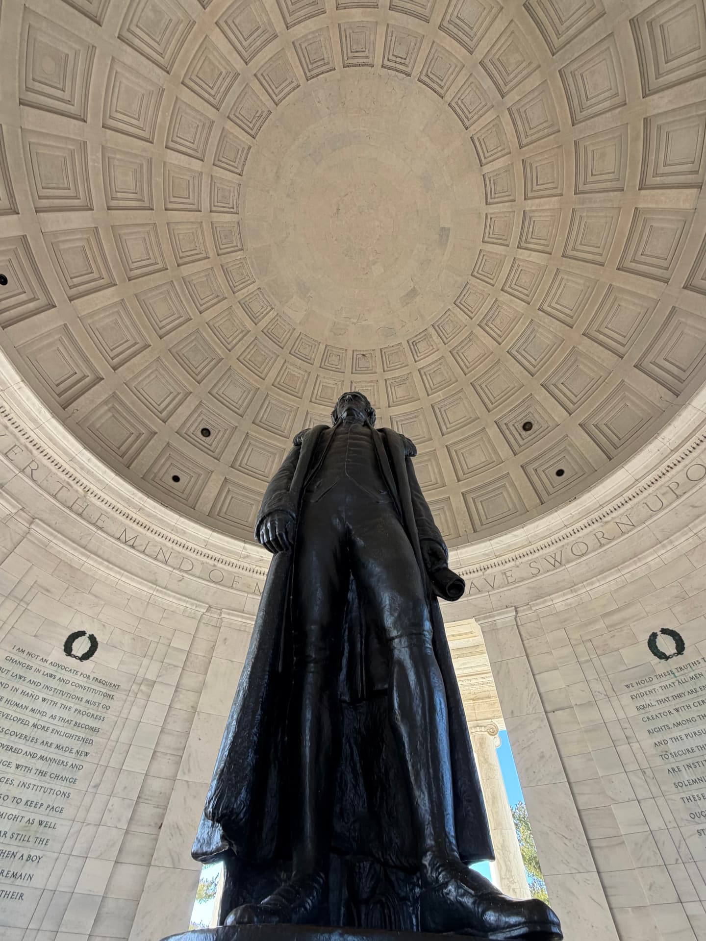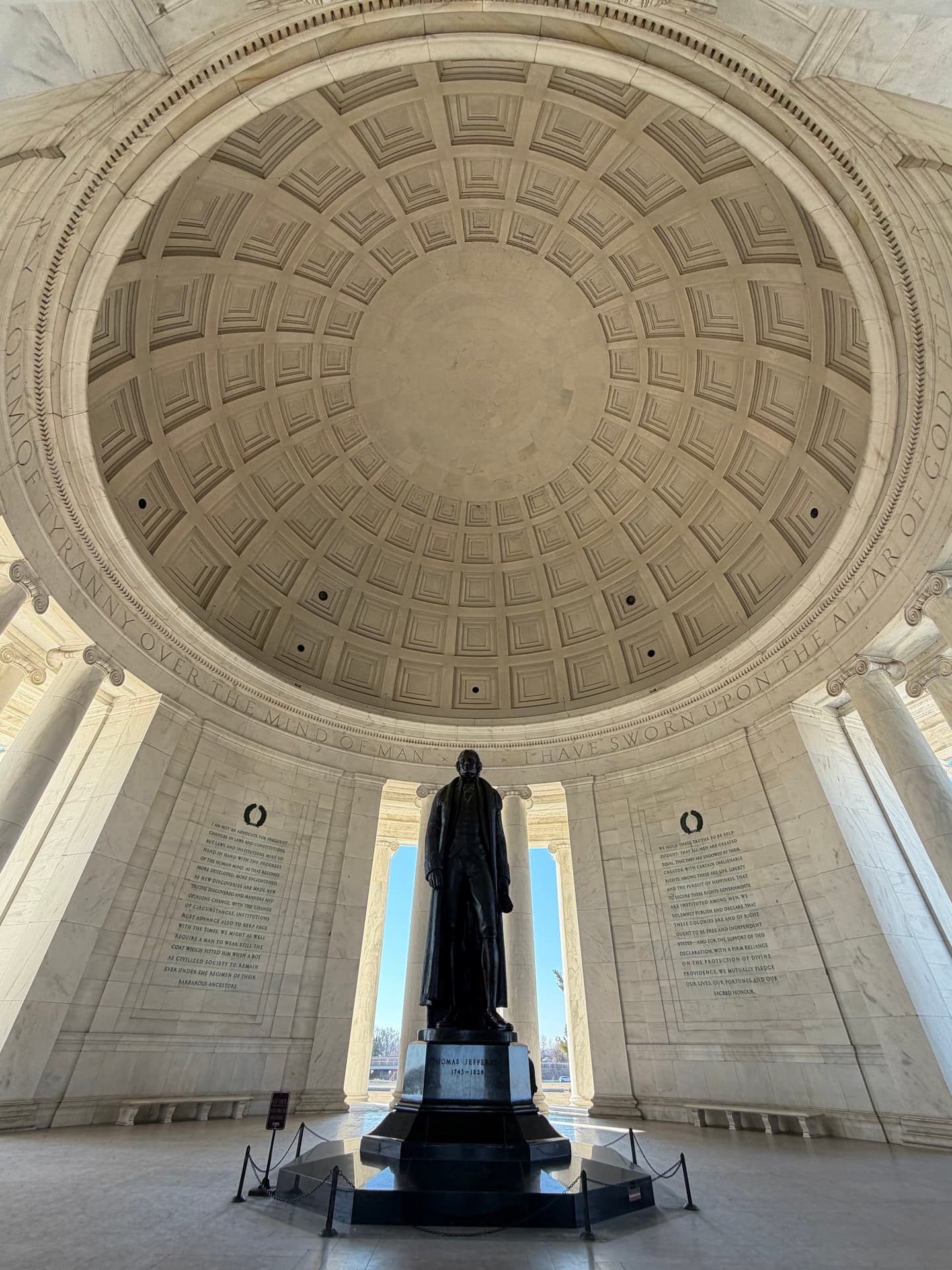 The memorial itself is no accident of design. Modeled after the Roman Pantheon, open to the sky, encircled by water, it is a temple of reason and liberty. The dome rises like a celestial vault. The Tidal Basin mirrors the heavens. Jefferson stands at the center—book in hand—as if transmitting a code. When you stand inside the Jefferson Memorial, you feel it immediately.