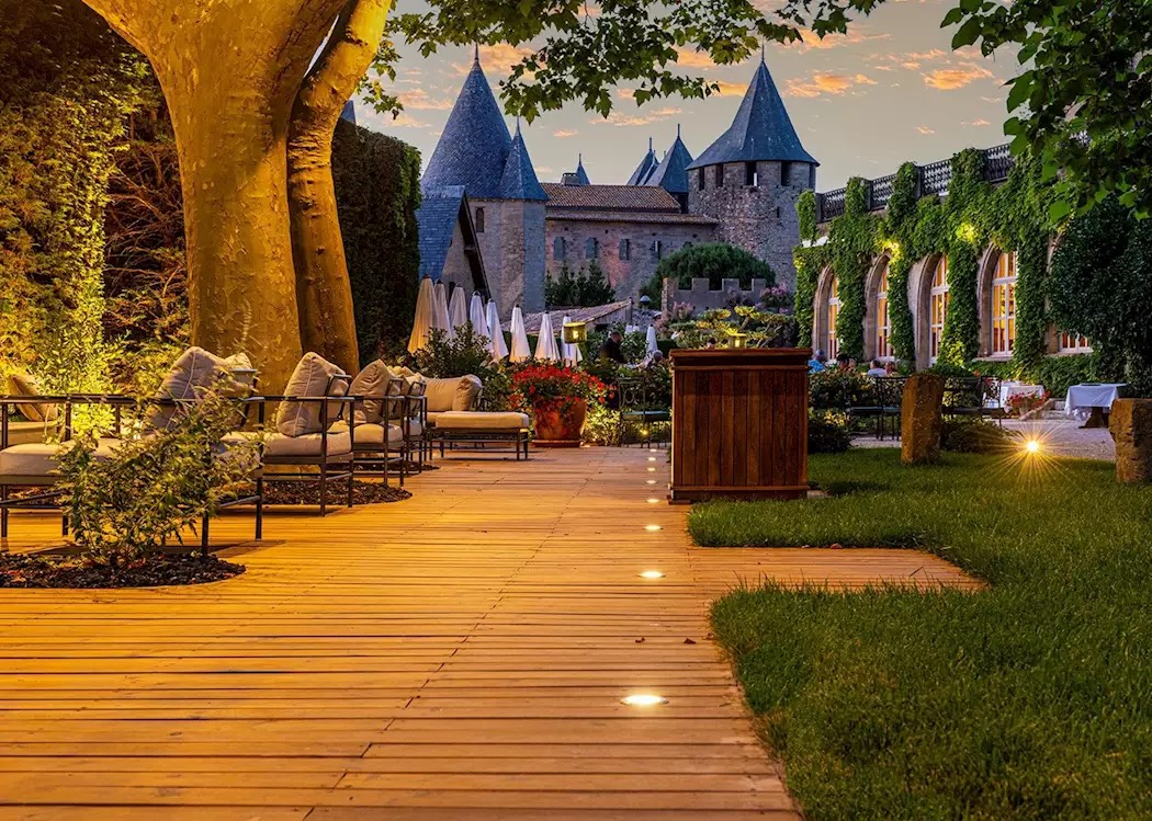 A jewel within the medieval ramparts of Carcassonne. This 5-star former bishop's palace features wood paneling, historic elegance, panoramic terrace, full-service spa, and lush gardens overlooking the Aude Valley.
