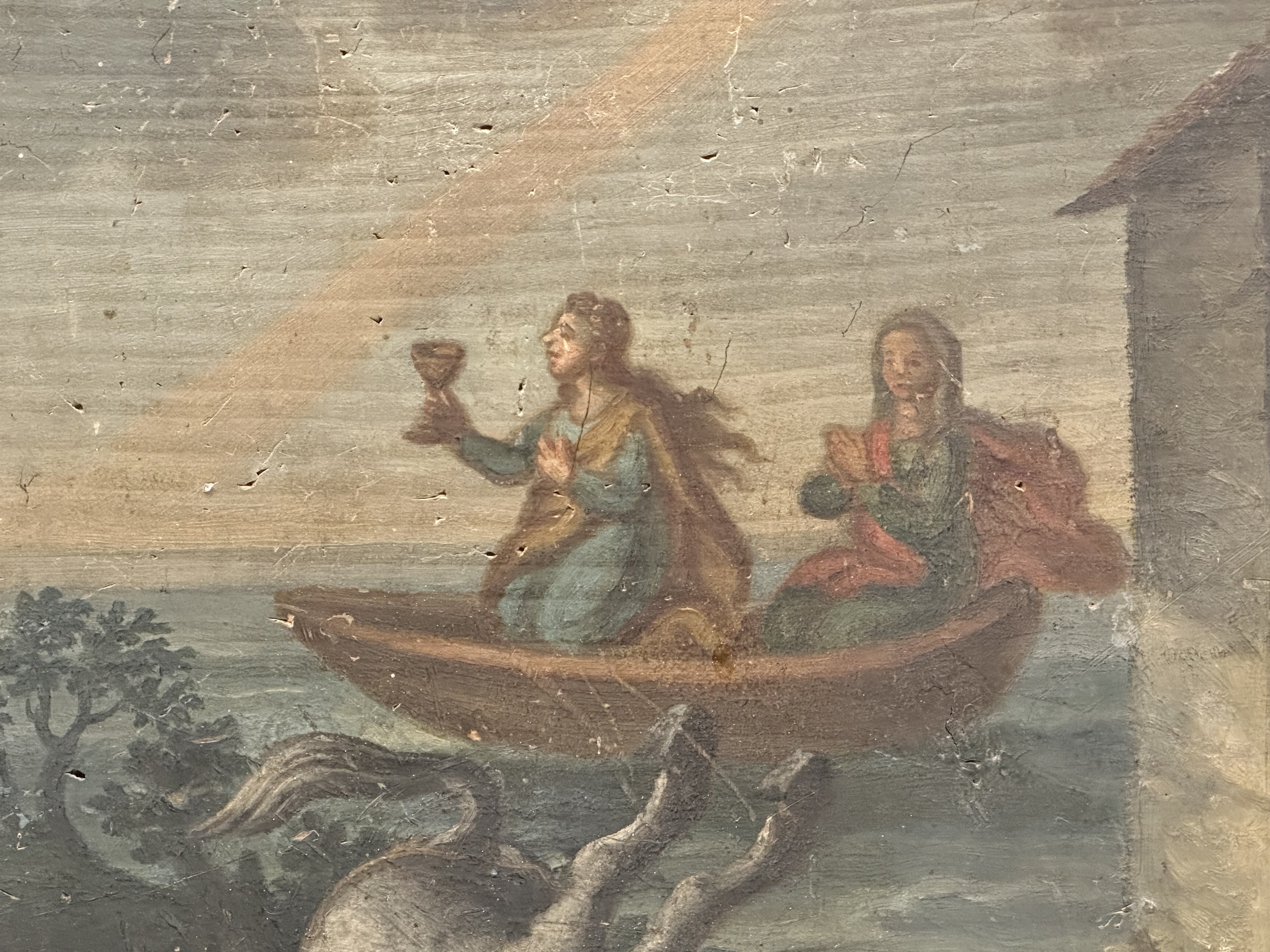 According to the Tradition of Provence, Mary Magdalene, Lazare of Bethany, and Maximinus, one of the Seventy Disciples and some companions, on the run from the Romans from the Holy Land after the Ascension of Christ, traversed the Mediterranean in a frail boat with neither rudder nor mast and landed at the place called Saintes-Maries-de-la-Mer, near Arles. With them they brought the Elixir of Elixirs, and says French tradition, the daughter of Jesus and Mary Magdalene. This Tradition is considered absolute Fact in Provence whose residents consider the Cave of Mary Magdalene to be the third most important Christian site after Jerusalem and Magdala. From here, Magdalene was transported seven times a day by angels into the presence of God, "where she heard, with her bodily ears, the delightful harmonies of the celestial choirs.